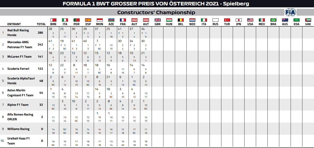 2021年F1コンストラクターズ・ランキング