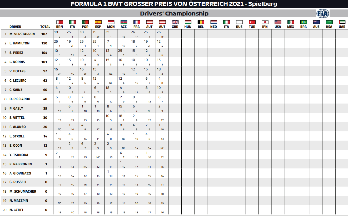 2021年F1オーストリアGPトップ10