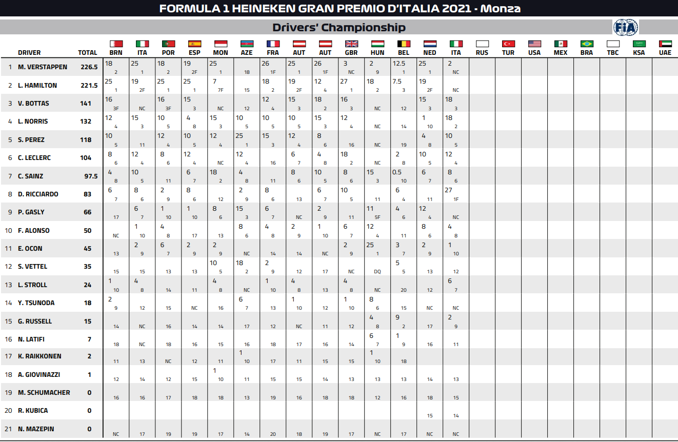 2021年F1イタリアGP全結果