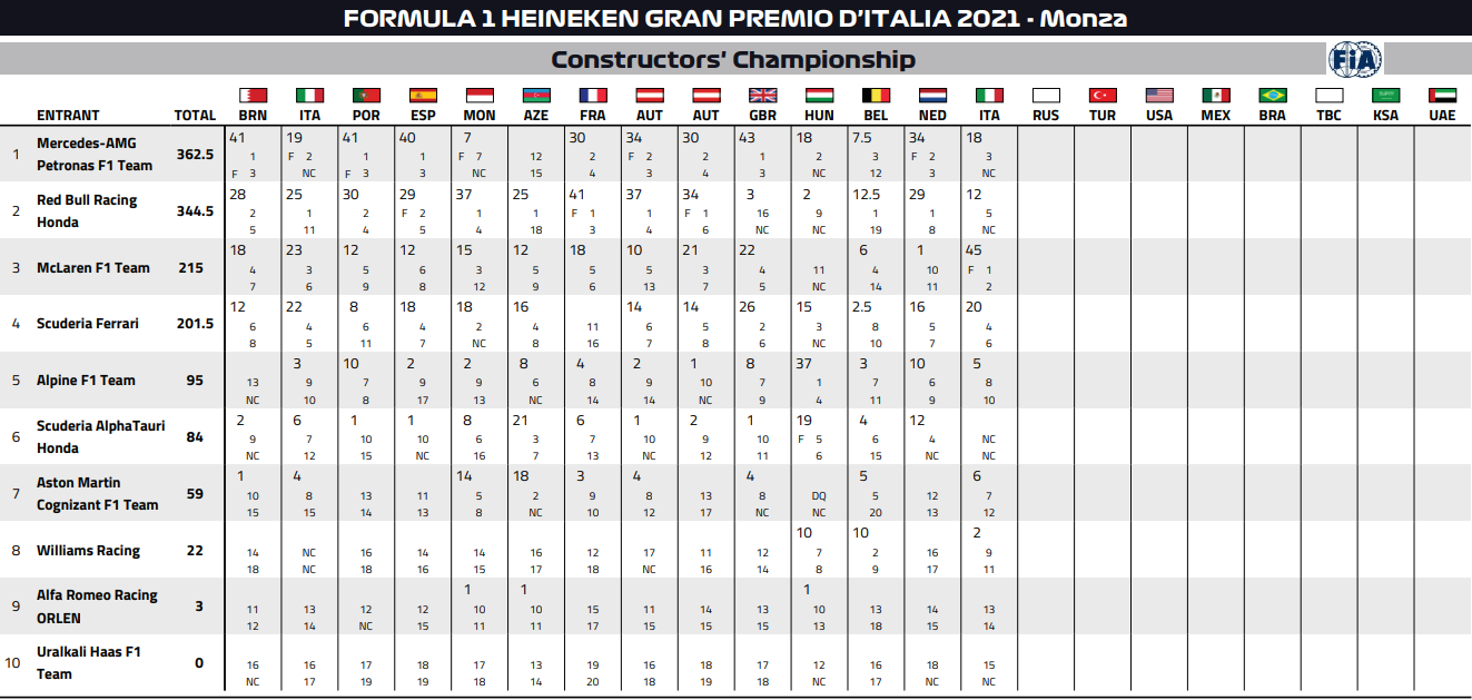 2021年F1コンストラクターズ・ランキング