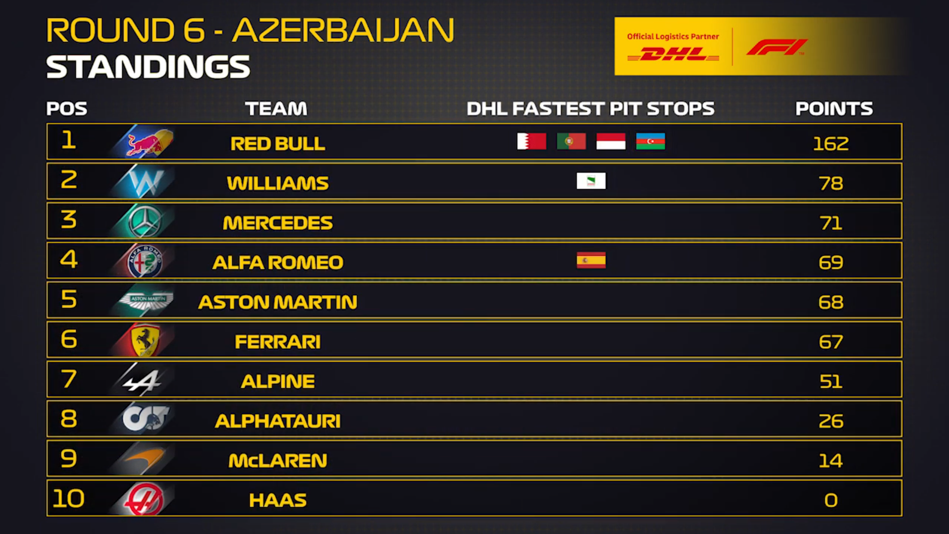 2021年06月06日F1最速ピットストップ チーム別ポイント・ランキング