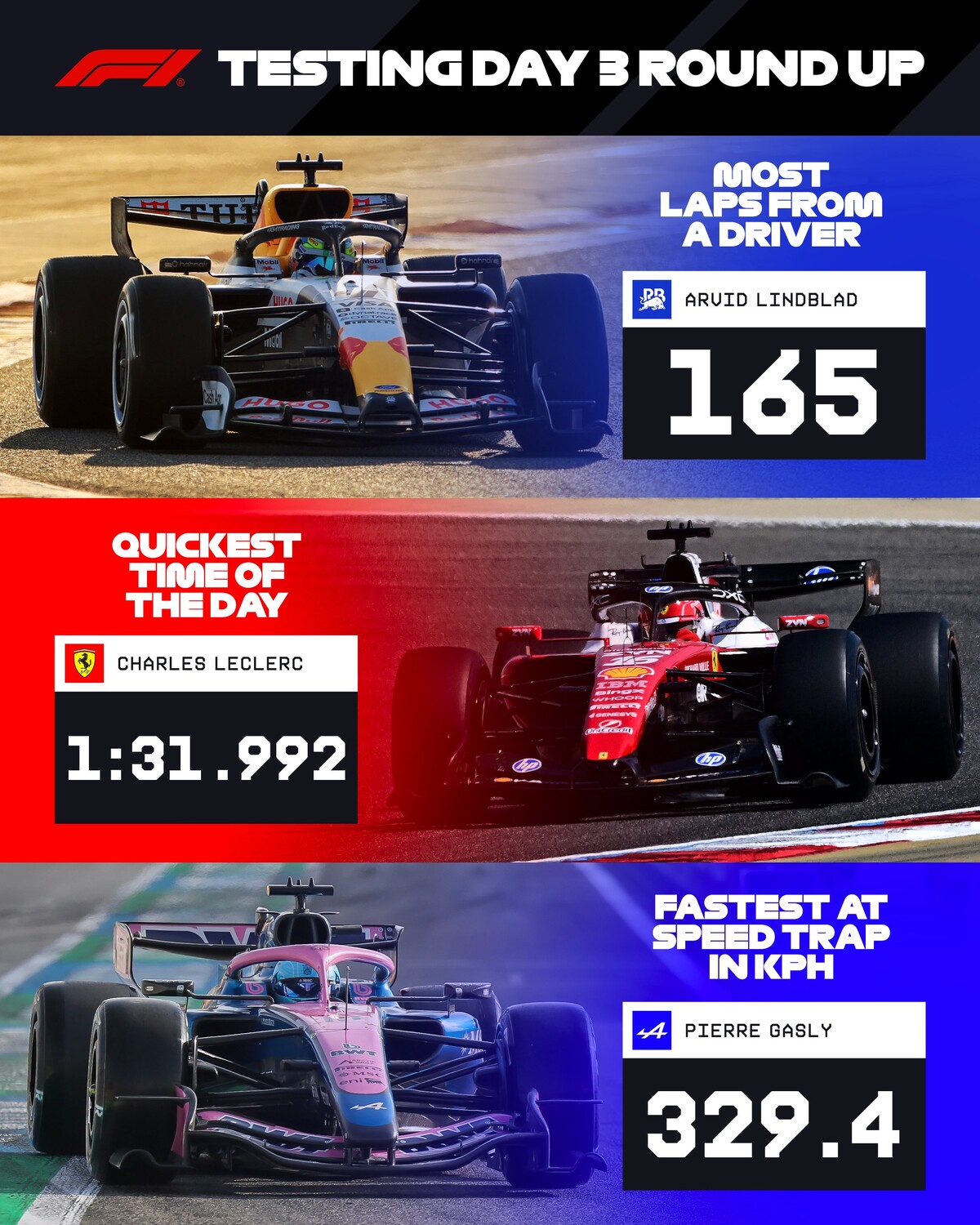 全11チーム17名のドライバーが走行し、最多周回数はリンドブラッド、最速ラップタイムはルクレール、トップスピードはガスリーが記録した。