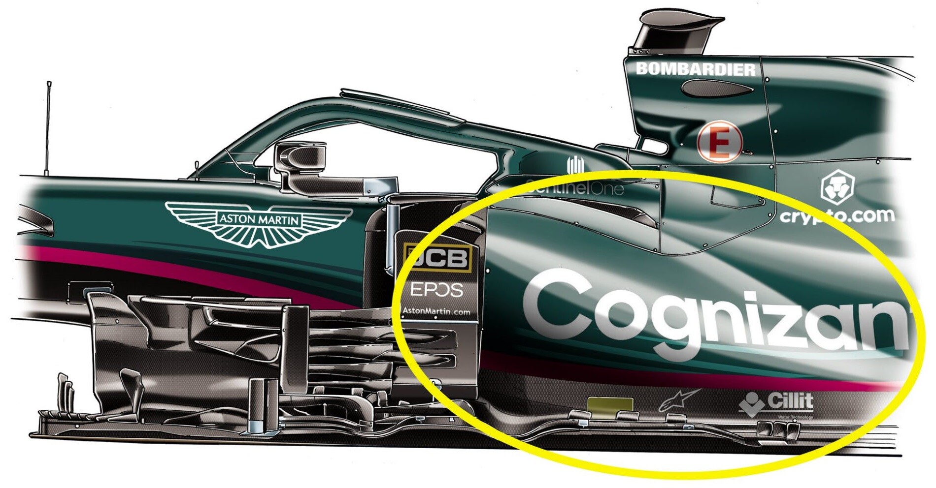 アストンマーティンは、継続的にこのフロア縁(フロアエッジ)を開発しており、バーレーンの開幕戦では、Zの前縁に余分の切り欠きがあった。そしてポルトガルではランス・ストロール、スペインではセバスチャン・ベッテルのマシンに、アップグレードの一環として、Zの前に3つ目の切り欠きがあるさらなる強化バージョンが導入された。