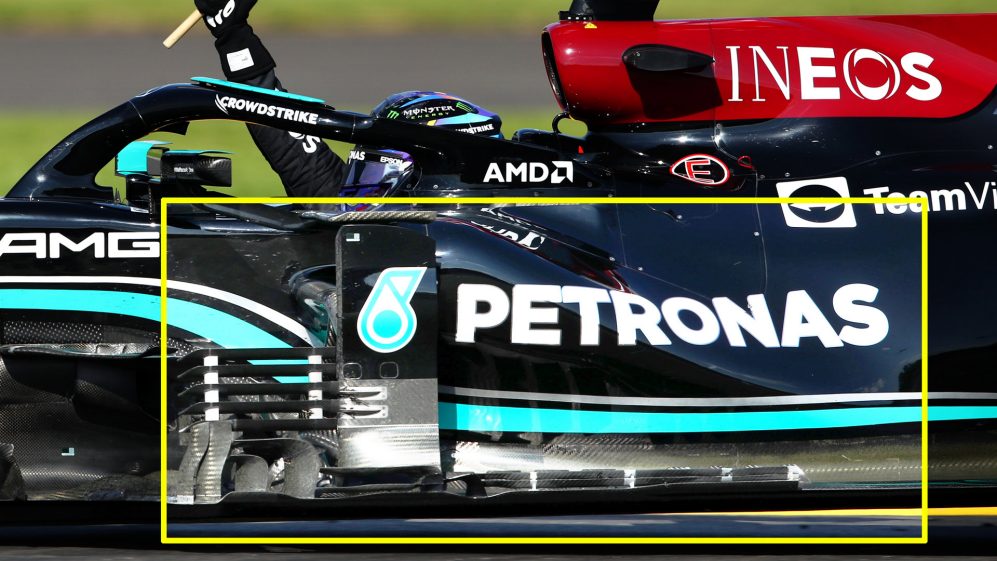 メルセデスW12のシルバーストンにおけるサイドポッドとバージボードの配置を示す写真