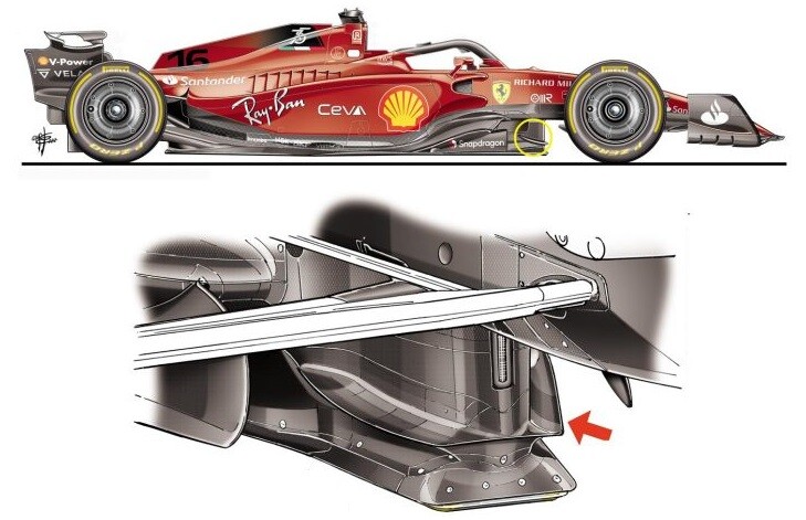 サイドポッドは、マシンの冷却システムの周囲に、よりタイトにパッケージされ、フロントのフロアの上面を露出させたので、アンダーカットをより漸進的に外側に膨らませることができるようになった。それに伴い、フロアの縁(エッジ)にも変更が加えられ、その縁に沿って、より強力な渦流を誘発する「カール」が新たに設けられた。