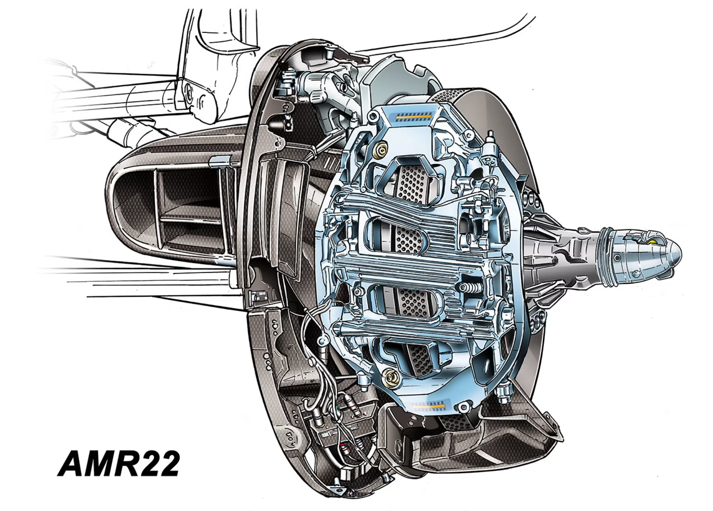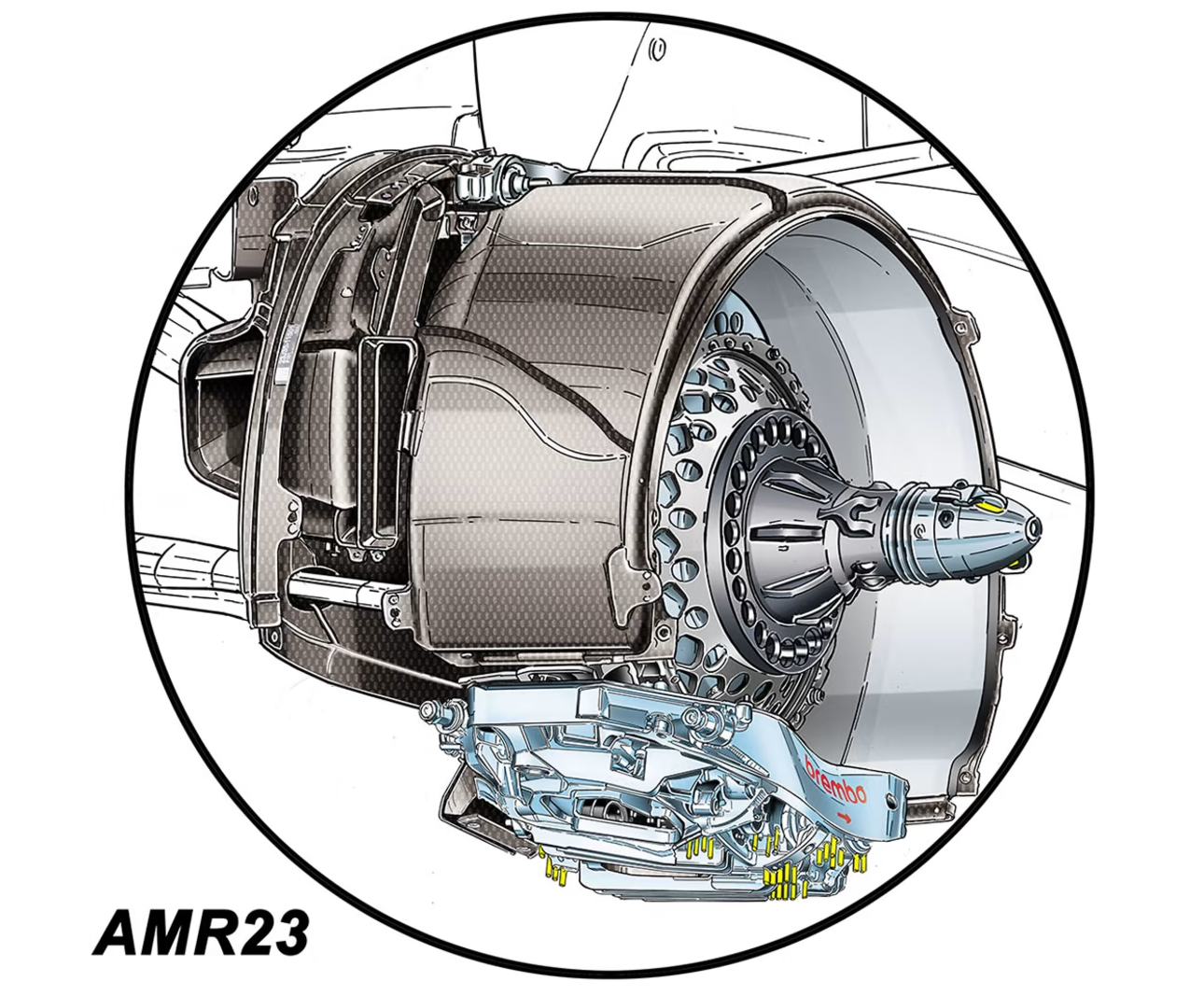 アストンマーティンは昨年、贅沢なリブ加工と機械加工を施したキャリパーを導入したが、今年はレッドブルがこれに続いた。今年のアストンマーティンは、複雑なキャリパーはそのままに、上の画像にあるように、ディスクの低い位置に配置し、重心を低くしている。