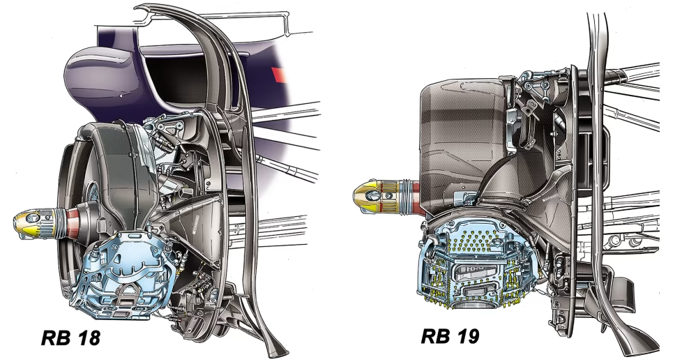 レッドブルRB19は、低い位置のキャリパーに複雑な冷却チャネルを備えている(右)。昨年のキャリパーも同じように取り付けられていたが、それほど大規模なドリル加工や機械加工は施されていなかった(左)。
