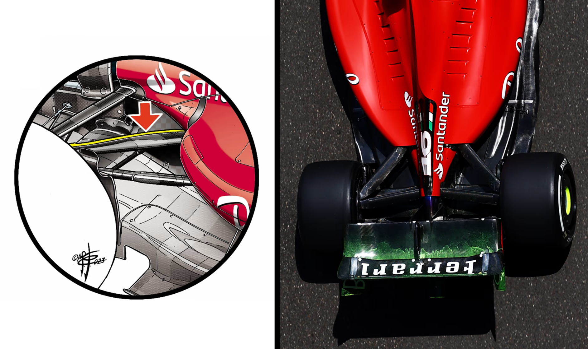 黄色い部分(左図)は、フェラーリSF-23の上部前側ウィッシュボーンに設けられた空力学的シースで、ダウンフォースを生成するパーツの上を流れる気流をより適切に制御する。