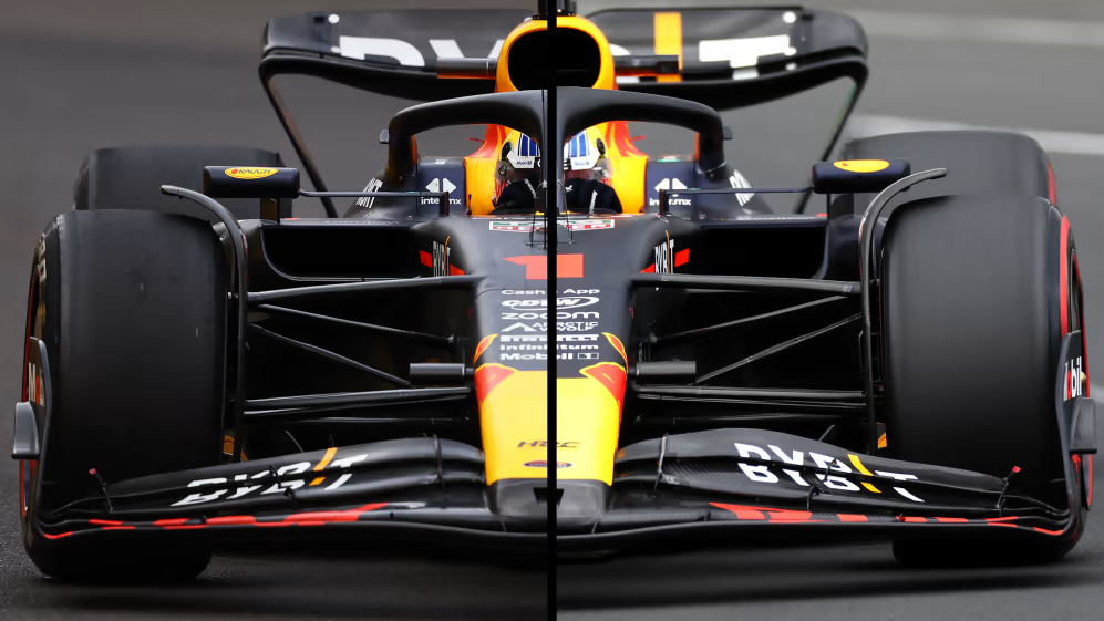 レッドブルRB19のラジエーター吸気口(左)は、従来(右)よりも広く深くなっているため、ボディやフロア端の変更と合わせて、空力と冷却の効率を向上させた。