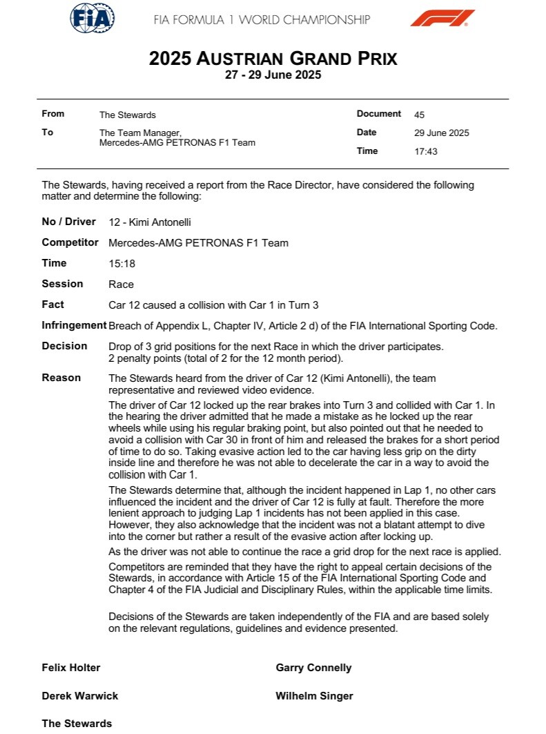 キミ・アントネッリ、次戦グリッド3番降格ペナルティ:2025年F1オーストラリアGP 2025年06月30日 06:52 オーストリアグランプリ、アンドレア・キミ・アントネッリは1周目のターン3でマックス・フェルスタッペンと衝突し、2台共にリタイヤした。その結果、アントネッリは次戦グリッド3番降格ペナルティと2ペナルティポイント(12ヶ月間累積2点)を科せられた。 < マックス・フェルスタッペン 決勝コメント:2025年F1オーストリアGPアイザック・ハジャー 決勝コメント:2025年F1オーストリアGP > アクセスランキング 本日 アクセスランキング 14日間 アクセスランキング 28日間 記事関連コメント or 誤字脱字誤訳誤変換その他間違いご指摘お願いします コメントフォーム 名前 コメント 評価する リセット リセット 顔 星 投稿する 情報を記憶
