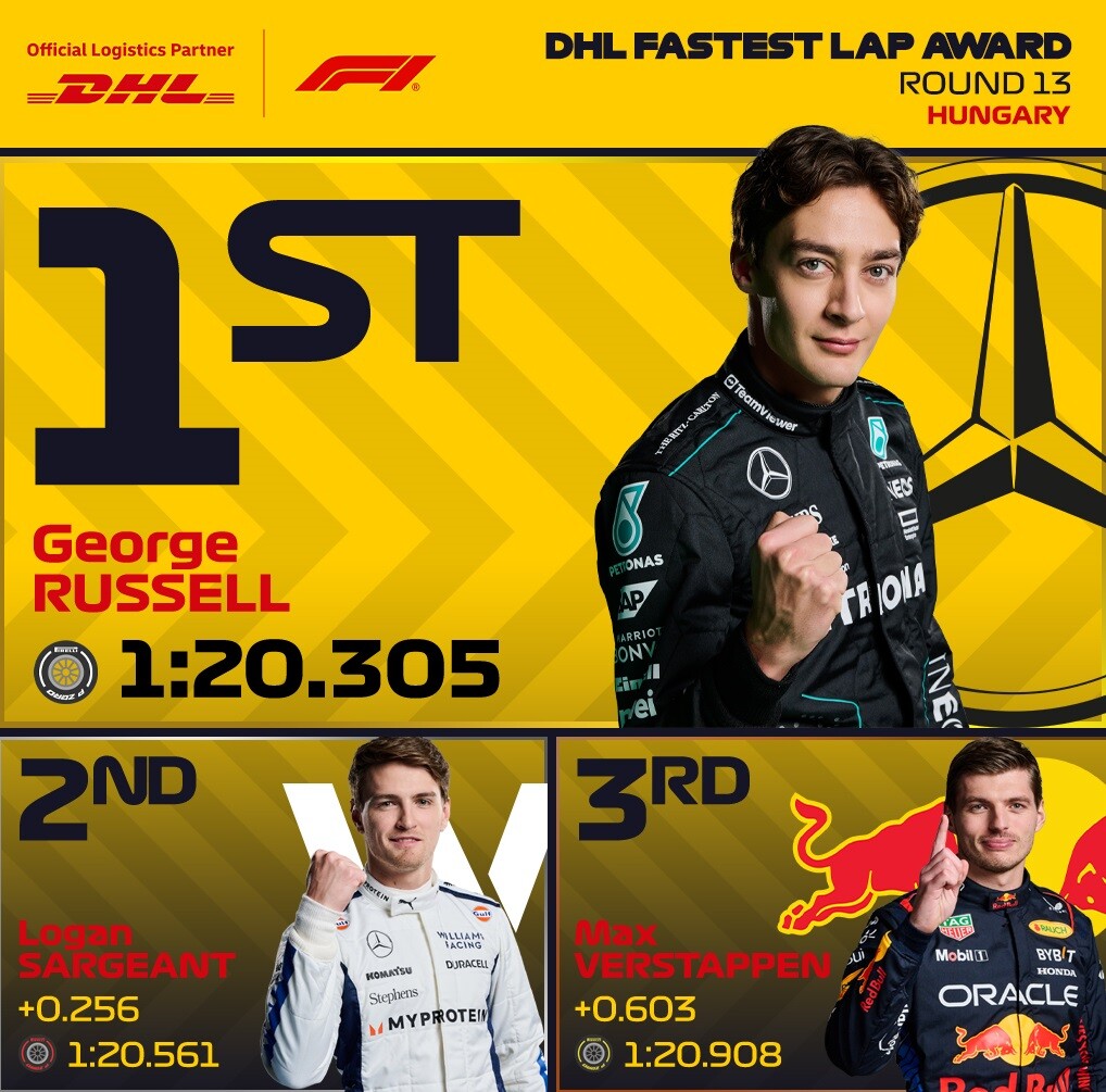 ラッセルはエミリア・ロマーニャ以来、今シーズン2回目の最速ラップタイム。2位はローガン・サージェント(ウィリアムズ)、3位はマックス・フェルスタッペン(レッドブル)、角田裕毅(RB)は18位。ハンガロリンでの最速ラップタイム順位は以下の通り。