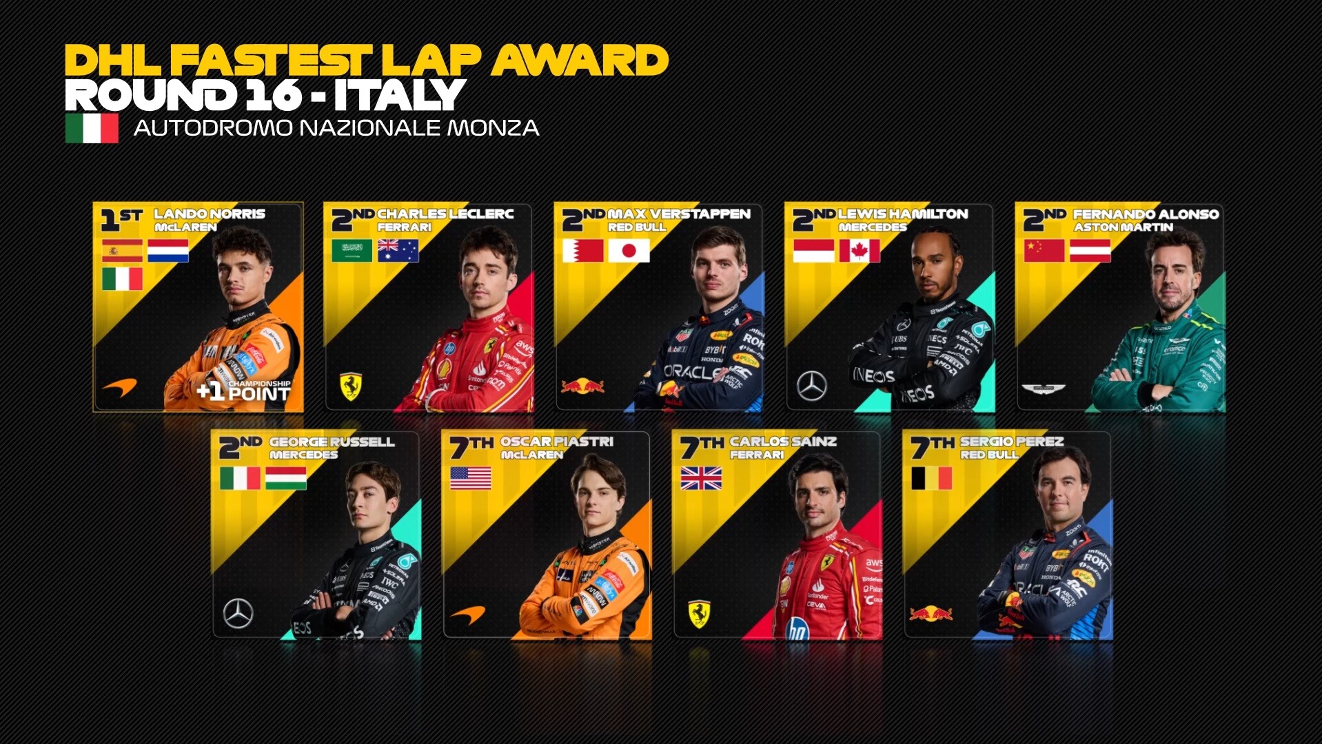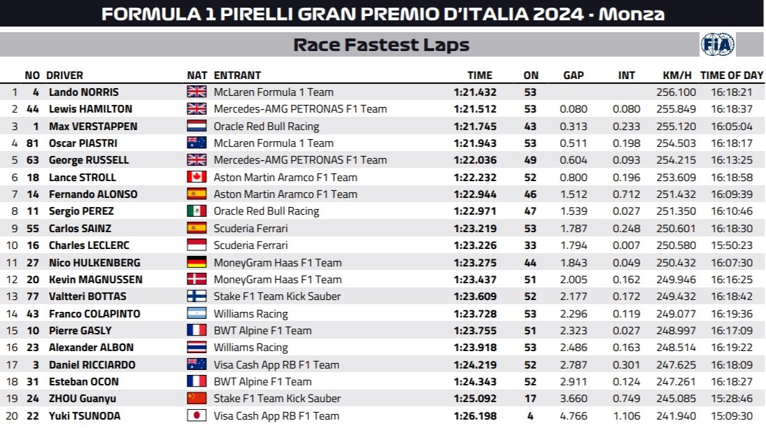 ノリスは、2戦連続で最終ラップに最速ラップタイム(今季3回目)を出した。ルイス・ハミルトンは0.08秒差で2位、3位はマックス・フェルスタッペン。モンツァの最速ラップタイム順位は以下の通り。