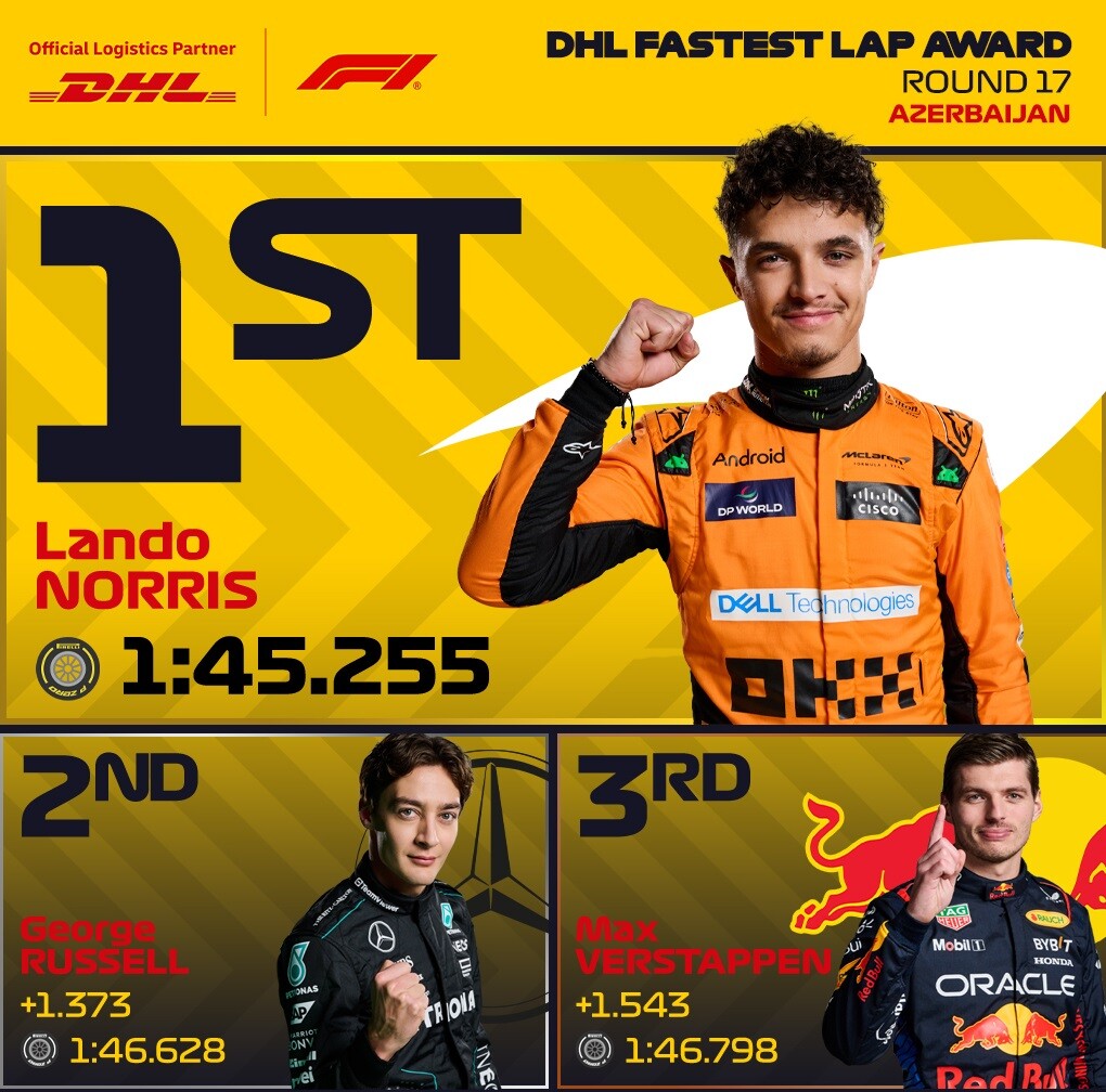ノリスは、3戦連続で最速ラップタイム(今季4回目)を出した。2位はジョージ・ラッセル、3位のマックス・フェルスタッペンは、最速ラップ狙いで50周目にソフトタイヤに交換したが、ぺレスとサインツのクラッシュでファイナルラップにバーチャルセーフティカーが出動したため、2度目のピットインが無駄になった。バクーの最速ラップタイム順位は以下の通り。