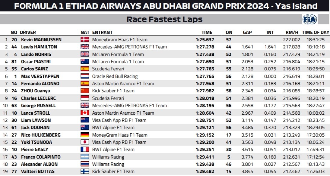 ハースでの最後のレース、マグヌッセンは最速狙いで55周目に中古のソフトタイヤに交換し、今季初の最速ラップタイムを出した。2位はハミルトン、3位はノリス。