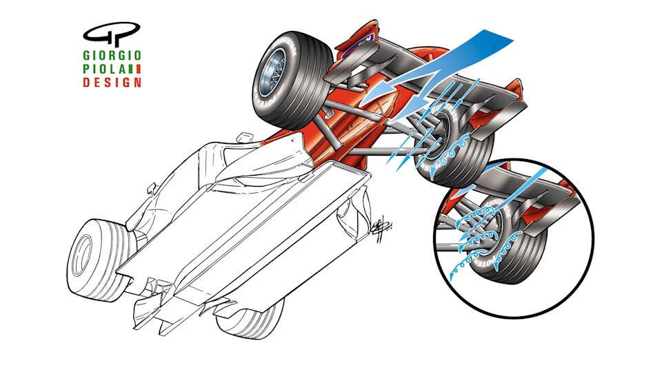 2000年代初頭、フェラーリはサイドポッドとフロアへの気流を改善するために、フロントホイールのリムの横に初めてドラムを配置した。