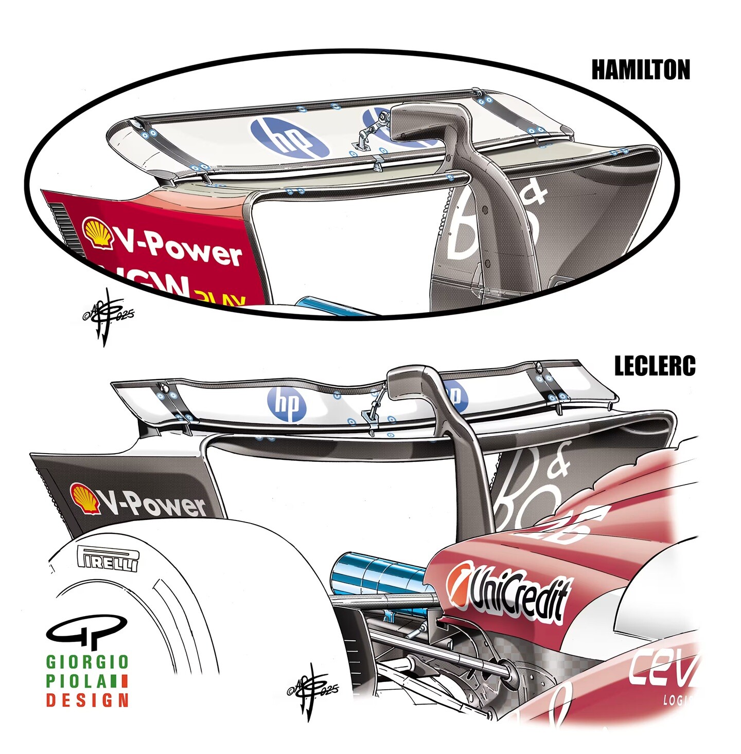 フェラーリSF-25:上画像、ハミルトンは週末を通してこのモンツァスタイルのウイングを使用し、ルクレールは初日に切り欠きバージョンを使った。下画像、ルクレールが予選とグランプリで使用したアゼルバイジャンスタイルのウイング。