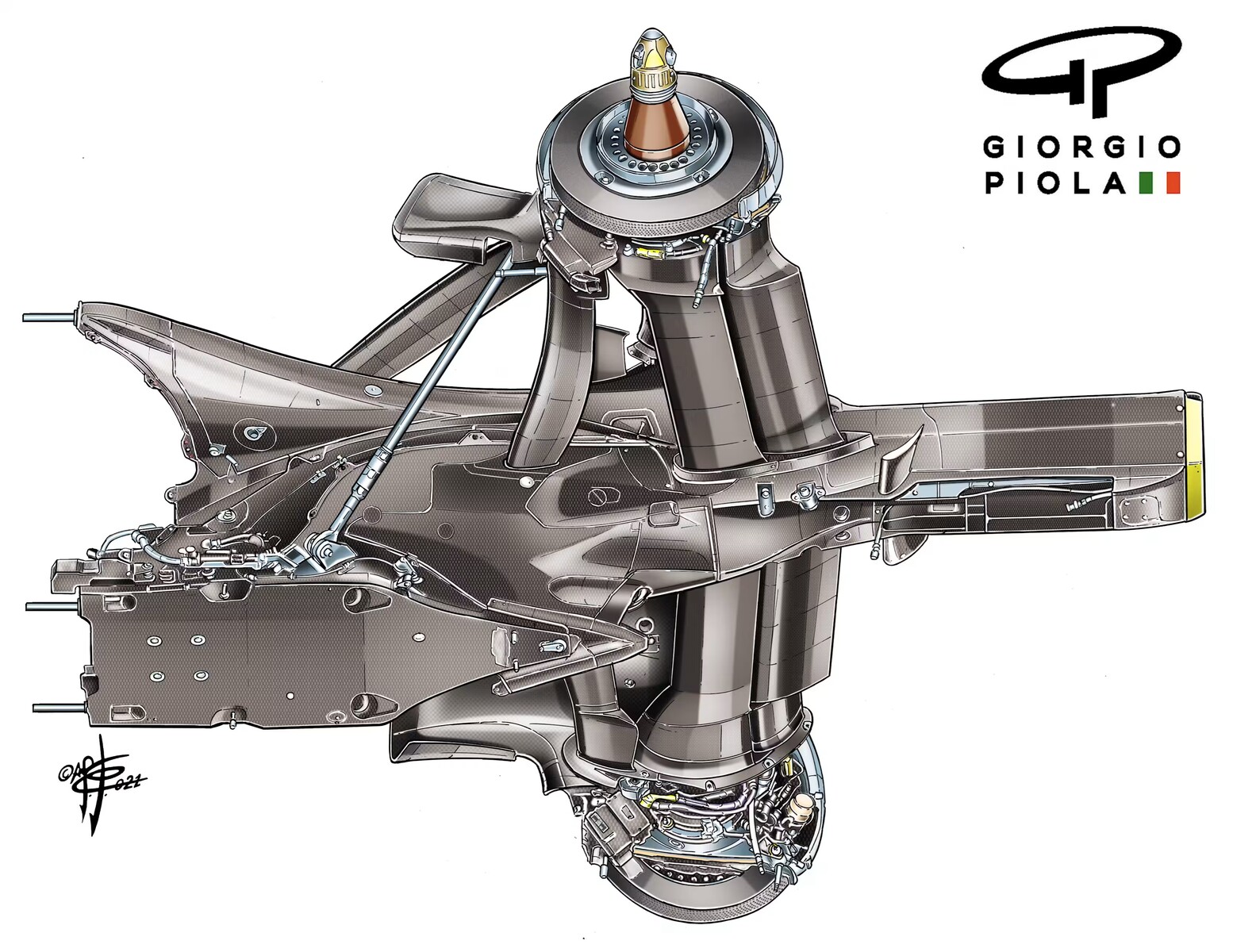このピオラのイラストは、レッドブルRB16B(レッドブルの2021年マシン)では、リアサスペンションがクラッシュ構造に取りつけられていたことを示している。これはアストンマーティンのAMR26の場合と同じである。