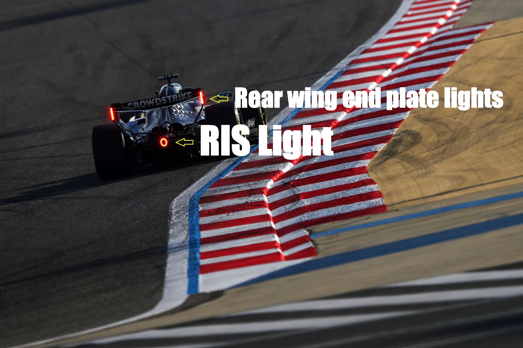 信号をさらに明確にするために、リアウイングのエンドプレートライトはRISライトの点滅パターンを反映し、常に赤色で表示される。