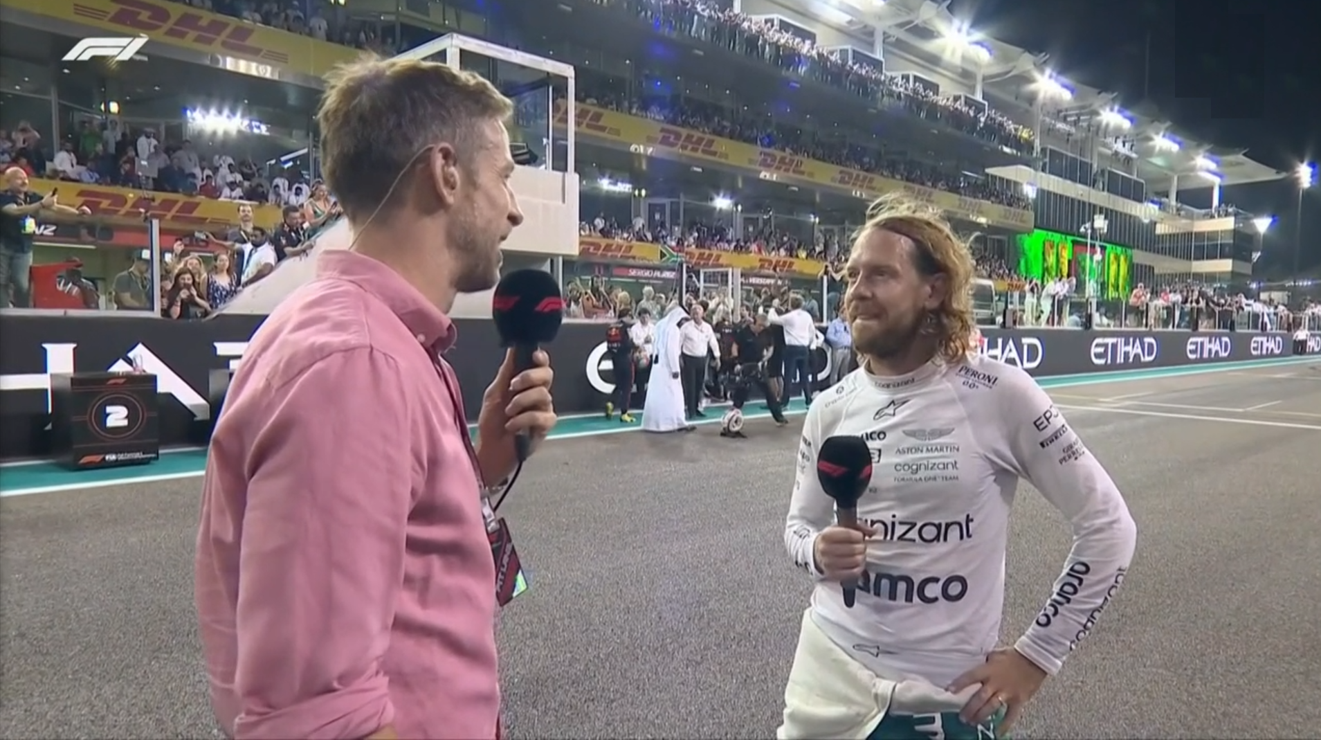 アブダビGP決勝レース直後のトップ3とベッテルのインタビューコメント。インタビュアーはジェンソン・バトン。